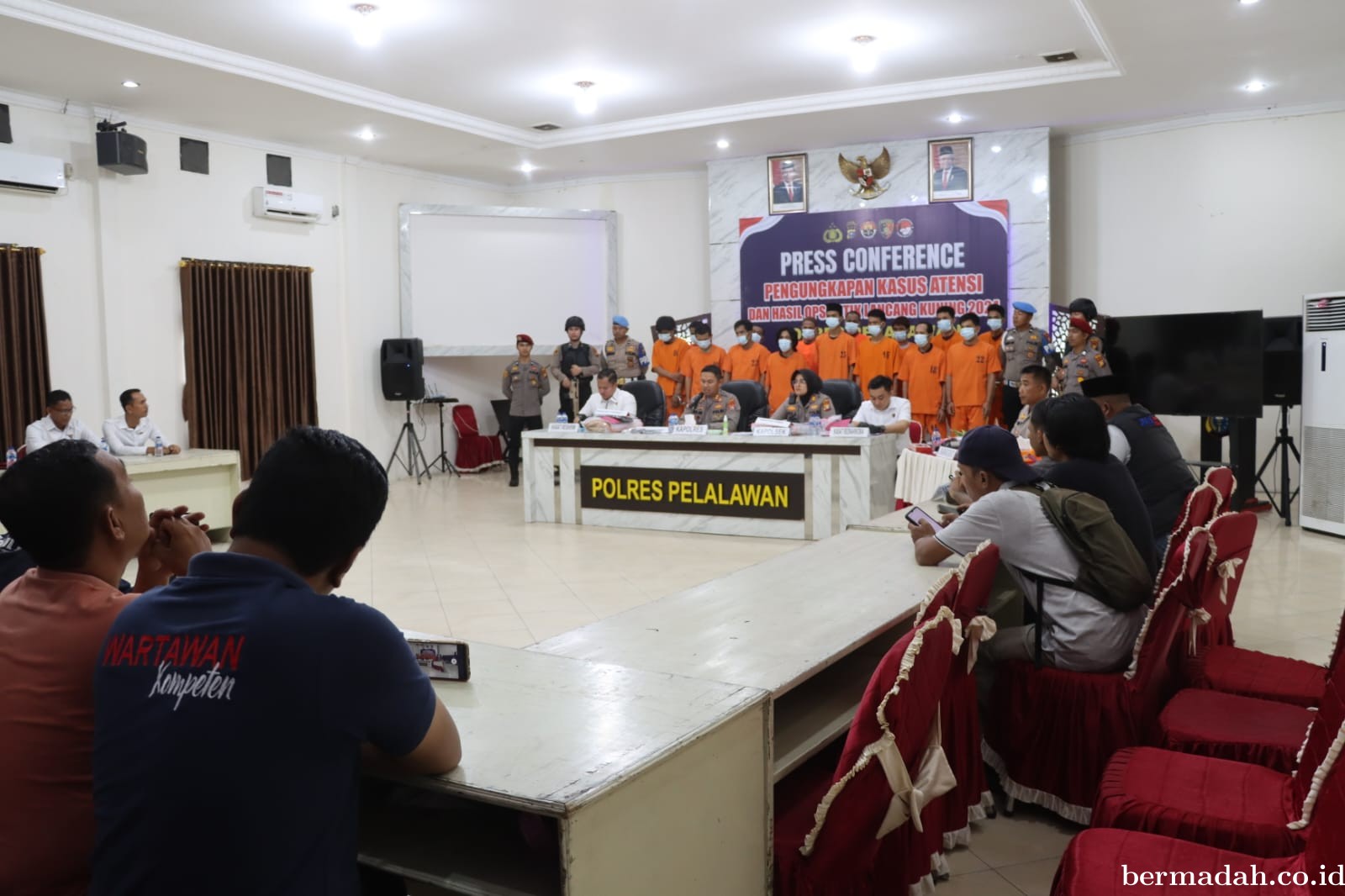 Kapolres Pelalawan AKBP Afrizal Asri SIK didampingi Kasat Reskrim AKP Kris Topel STrK SIK, Kapolsek Pangkalan Kerinci AKP Viola Dwi Anggreni SIK, Kasat Narkoba Iptu Ferlanda, SIK Kasi Humas AKP Edy Haryanto SH MH menyampaikan selama operasi antik berhasil mengungkap empat kasus yang di atensikan Polres Pelalawan.
