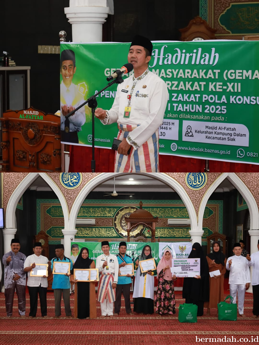 BERMADAH.CO.ID, SIAK - Plh Sekretaris Daerah (Sekda) Kabupaten Siak, Fauzi Asni menyerahkan zakat konsumtif dan produktif kepada mustahik dalam acara Gerakan Masyarakat (GEMAR) Siak Berzakat ke-12 tahap I tahun 2025 di Masjid Al-Fatah, Kampung Dalam, Kota Siak Sri Indrapura.